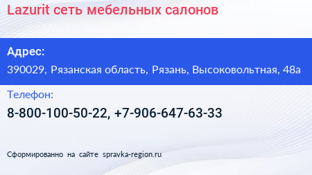 Lazurit, сеть мебельных салонов по адресу 390029, Рязанская область, Рязань, Высоковольтная, 48а в дальнейшем Организация, размещена в следующих категориях: