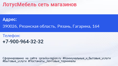 ЛотусМебель, сеть магазинов по адресу 390026, Рязанская область, Рязань, Гагарина, 164 в дальнейшем Организация, размещена в следующих категориях: