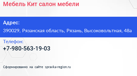 Мебель-Кит, салон мебели по адресу 390029, Рязанская область, Рязань, Высоковольтная, 48а в дальнейшем Организация, размещена в следующих категориях: