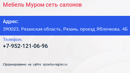 Мебель Муром, сеть салонов по адресу 390023, Рязанская область, Рязань, проезд Яблочкова, 4Б в дальнейшем Организация, размещена в следующих категориях: