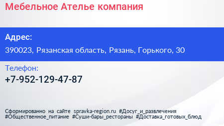 Мебельное Ателье, компания по адресу 390023, Рязанская область, Рязань, Горького, 30 в дальнейшем Организация, размещена в следующих категориях: