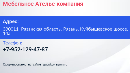 Мебельное Ателье, компания по адресу 390011, Рязанская область, Рязань, Куйбышевское шоссе, 14а в дальнейшем Организация, размещена в следующих категориях: