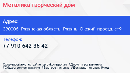 Металика, творческий дом по адресу 390006, Рязанская область, Рязань, Окский проезд, ст9 в дальнейшем Организация, размещена в следующих категориях: