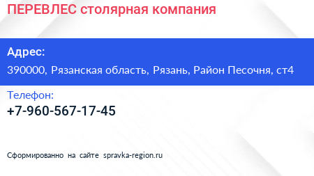 ПЕРЕВЛЕС, столярная компания по адресу 390000, Рязанская область, Рязань, Район Песочня, ст4 в дальнейшем Организация, размещена в следующих категориях: