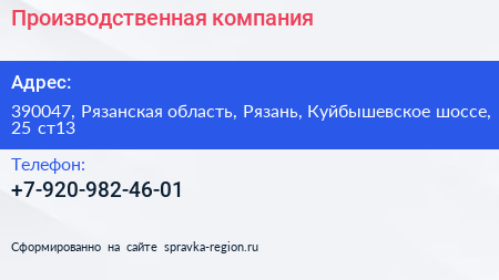 Производственная компания по адресу 390047, Рязанская область, Рязань, Куйбышевское шоссе, 25 ст13 в дальнейшем Организация, размещена в следующих категориях: