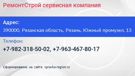 РемонтСтрой, сервисная компания по адресу 390000, Рязанская область, Рязань, Южный промузел, 13 в дальнейшем Организация, размещена в следующих категориях: