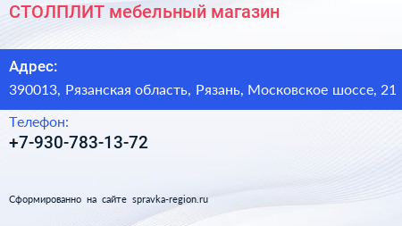 СТОЛПЛИТ, мебельный магазин по адресу 390013, Рязанская область, Рязань, Московское шоссе, 21 в дальнейшем Организация, размещена в следующих категориях: