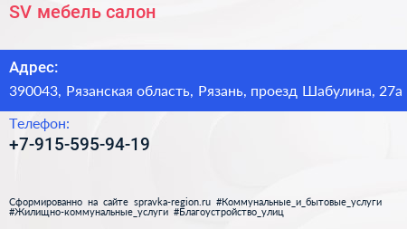 SV мебель, салон по адресу 390043, Рязанская область, Рязань, проезд Шабулина, 27а в дальнейшем Организация, размещена в следующих категориях: