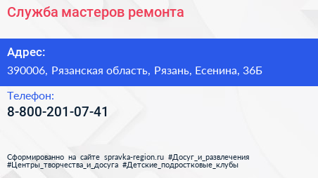 Служба мастеров ремонта по адресу 390006, Рязанская область, Рязань, Есенина, 36Б в дальнейшем Организация, размещена в следующих категориях: