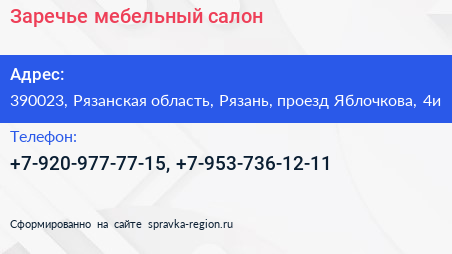 Заречье, мебельный салон по адресу 390023, Рязанская область, Рязань, проезд Яблочкова, 4и в дальнейшем Организация, размещена в следующих категориях: