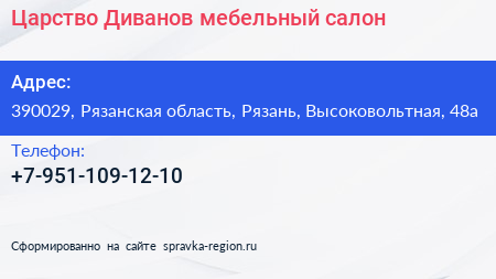 Царство Диванов, мебельный салон по адресу 390029, Рязанская область, Рязань, Высоковольтная, 48а в дальнейшем Организация, размещена в следующих категориях: