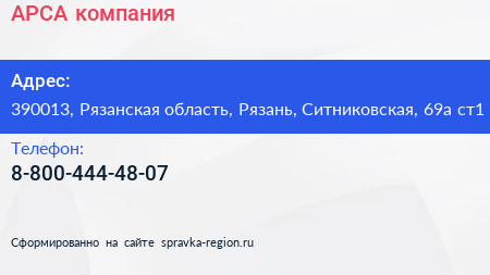 АРСА, компания по адресу 390013, Рязанская область, Рязань, Ситниковская, 69а ст1 в дальнейшем Организация, размещена в следующих категориях: