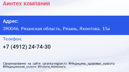 Аинтех, компания по адресу 390046, Рязанская область, Рязань, Яхонтова, 15а в дальнейшем Организация, размещена в следующих категориях: