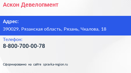 Аскон-Девелопмент по адресу 390029, Рязанская область, Рязань, Чкалова, 18 в дальнейшем Организация, размещена в следующих категориях: