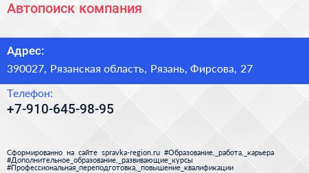 Автопоиск, компания по адресу 390027, Рязанская область, Рязань, Фирсова, 27 в дальнейшем Организация, размещена в следующих категориях: