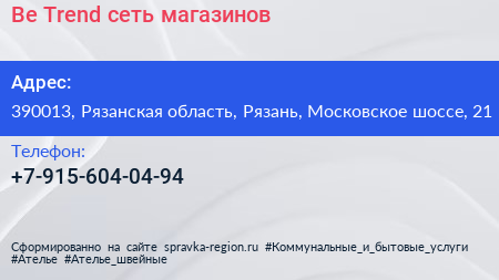 Be Trend, сеть магазинов по адресу 390013, Рязанская область, Рязань, Московское шоссе, 21 в дальнейшем Организация, размещена в следующих категориях: