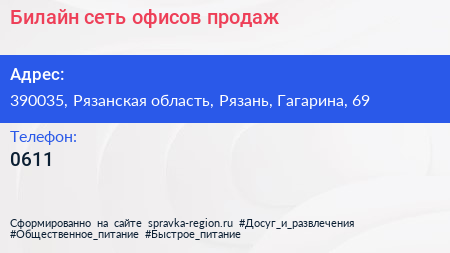 Билайн, сеть офисов продаж по адресу 390035, Рязанская область, Рязань, Гагарина, 69 в дальнейшем Организация, размещена в следующих категориях: