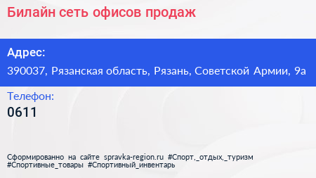 Билайн, сеть офисов продаж по адресу 390037, Рязанская область, Рязань, Советской Армии, 9а в дальнейшем Организация, размещена в следующих категориях: