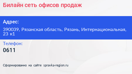 Билайн, сеть офисов продаж по адресу 390039, Рязанская область, Рязань, Интернациональная, 23 к1 в дальнейшем Организация, размещена в следующих категориях: