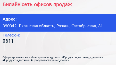 Билайн, сеть офисов продаж по адресу 390042, Рязанская область, Рязань, Октябрьская, 31 в дальнейшем Организация, размещена в следующих категориях: