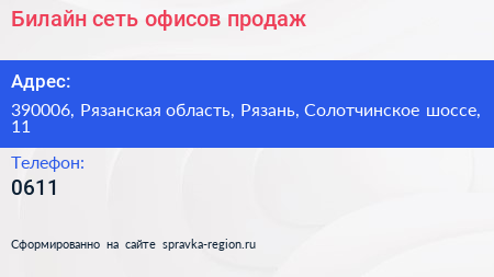 Билайн, сеть офисов продаж по адресу 390006, Рязанская область, Рязань, Солотчинское шоссе, 11 в дальнейшем Организация, размещена в следующих категориях: