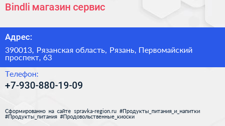 Bindli, магазин-сервис по адресу 390013, Рязанская область, Рязань, Первомайский проспект, 63 в дальнейшем Организация, размещена в следующих категориях: