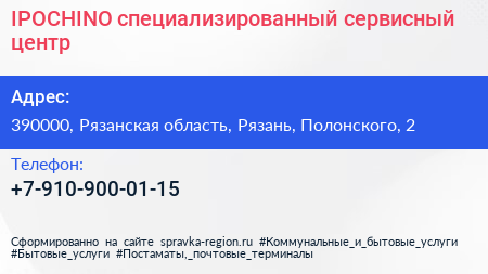 IPOCHINO, специализированный сервисный центр по адресу 390000, Рязанская область, Рязань, Полонского, 2 в дальнейшем Организация, размещена в следующих категориях: