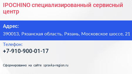 IPOCHINO, специализированный сервисный центр по адресу 390013, Рязанская область, Рязань, Московское шоссе, 21 в дальнейшем Организация, размещена в следующих категориях: