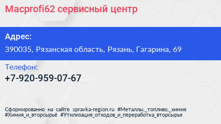 Macprofi62, сервисный центр по адресу 390035, Рязанская область, Рязань, Гагарина, 69 в дальнейшем Организация, размещена в следующих категориях: