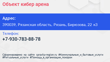 Объект, кибер-арена по адресу 390039, Рязанская область, Рязань, Бирюзова, 22 к3 в дальнейшем Организация, размещена в следующих категориях: