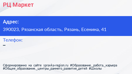 РЦ Маркет по адресу 390023, Рязанская область, Рязань, Есенина, 41 в дальнейшем Организация, размещена в следующих категориях: