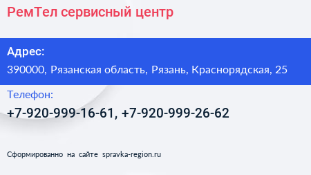РемТел, сервисный центр по адресу 390000, Рязанская область, Рязань, Краснорядская, 25 в дальнейшем Организация, размещена в следующих категориях: