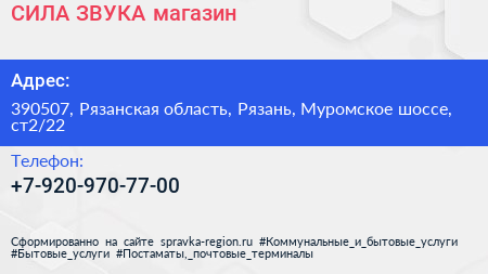 СИЛА ЗВУКА, магазин по адресу 390507, Рязанская область, Рязань, Муромское шоссе, ст2/22 в дальнейшем Организация, размещена в следующих категориях: