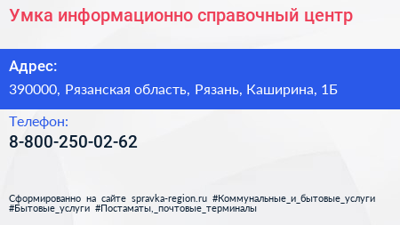Умка, информационно-справочный центр по адресу 390000, Рязанская область, Рязань, Каширина, 1Б в дальнейшем Организация, размещена в следующих категориях: