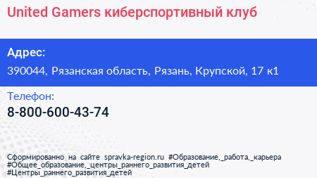 United Gamers, киберспортивный клуб по адресу 390044, Рязанская область, Рязань, Крупской, 17 к1 в дальнейшем Организация, размещена в следующих категориях: