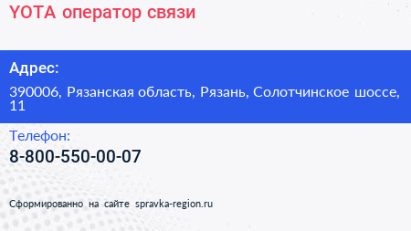 YOTA, оператор связи по адресу 390006, Рязанская область, Рязань, Солотчинское шоссе, 11 в дальнейшем Организация, размещена в следующих категориях: