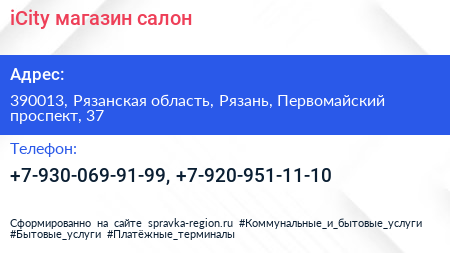 iCity, магазин-салон по адресу 390013, Рязанская область, Рязань, Первомайский проспект, 37 в дальнейшем Организация, размещена в следующих категориях:
