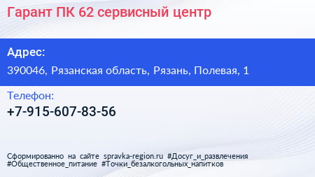 Гарант ПК-62, сервисный центр по адресу 390046, Рязанская область, Рязань, Полевая, 1 в дальнейшем Организация, размещена в следующих категориях: