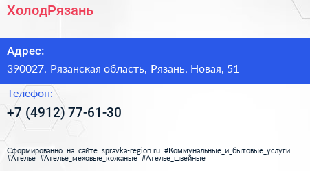 ХолодРязань по адресу 390027, Рязанская область, Рязань, Новая, 51 в дальнейшем Организация, размещена в следующих категориях: