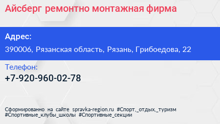 Айсберг, ремонтно-монтажная фирма по адресу 390006, Рязанская область, Рязань, Грибоедова, 22 в дальнейшем Организация, размещена в следующих категориях: