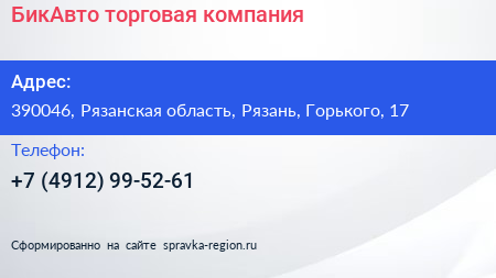 БикАвто, торговая компания по адресу 390046, Рязанская область, Рязань, Горького, 17 в дальнейшем Организация, размещена в следующих категориях: