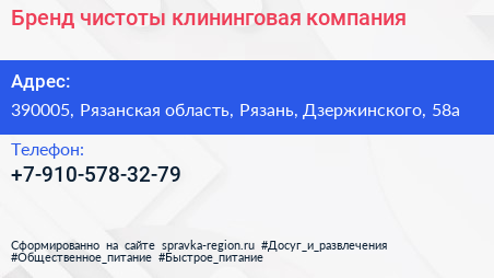 Бренд чистоты, клининговая компания по адресу 390005, Рязанская область, Рязань, Дзержинского, 58а в дальнейшем Организация, размещена в следующих категориях: