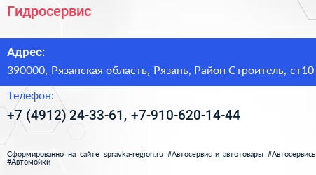 Гидросервис по адресу 390000, Рязанская область, Рязань, Район Строитель, ст10 в дальнейшем Организация, размещена в следующих категориях: