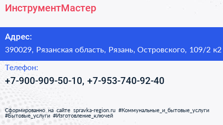 ИнструментМастер по адресу 390029, Рязанская область, Рязань, Островского, 109/2 к2 в дальнейшем Организация, размещена в следующих категориях:
