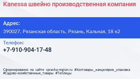Kanessa, швейно-производственная компания по адресу 390027, Рязанская область, Рязань, Кальная, 18 к2 в дальнейшем Организация, размещена в следующих категориях: