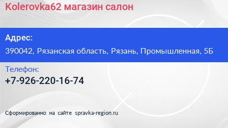 Kolerovka62, магазин-салон по адресу 390042, Рязанская область, Рязань, Промышленная, 5Б в дальнейшем Организация, размещена в следующих категориях: