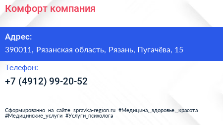 Комфорт, компания по адресу 390011, Рязанская область, Рязань, Пугачёва, 15 в дальнейшем Организация, размещена в следующих категориях: