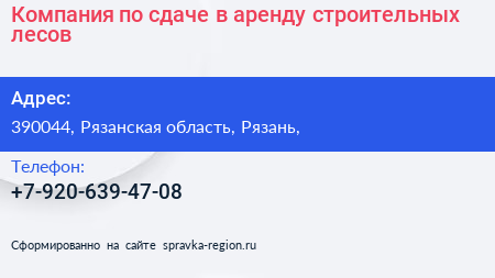 Компания по сдаче в аренду строительных лесов по адресу 390044, Рязанская область, Рязань, в дальнейшем Организация, размещена в следующих категориях: