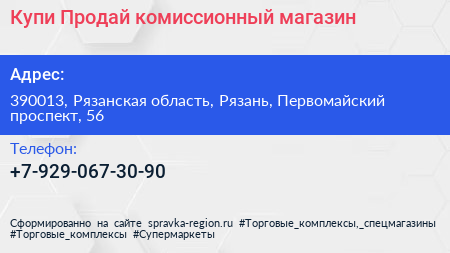 Купи-Продай, комиссионный магазин по адресу 390013, Рязанская область, Рязань, Первомайский проспект, 56 в дальнейшем Организация, размещена в следующих категориях: