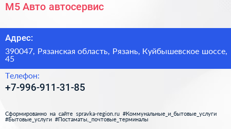 М5 Авто, автосервис по адресу 390047, Рязанская область, Рязань, Куйбышевское шоссе, 45 в дальнейшем Организация, размещена в следующих категориях: